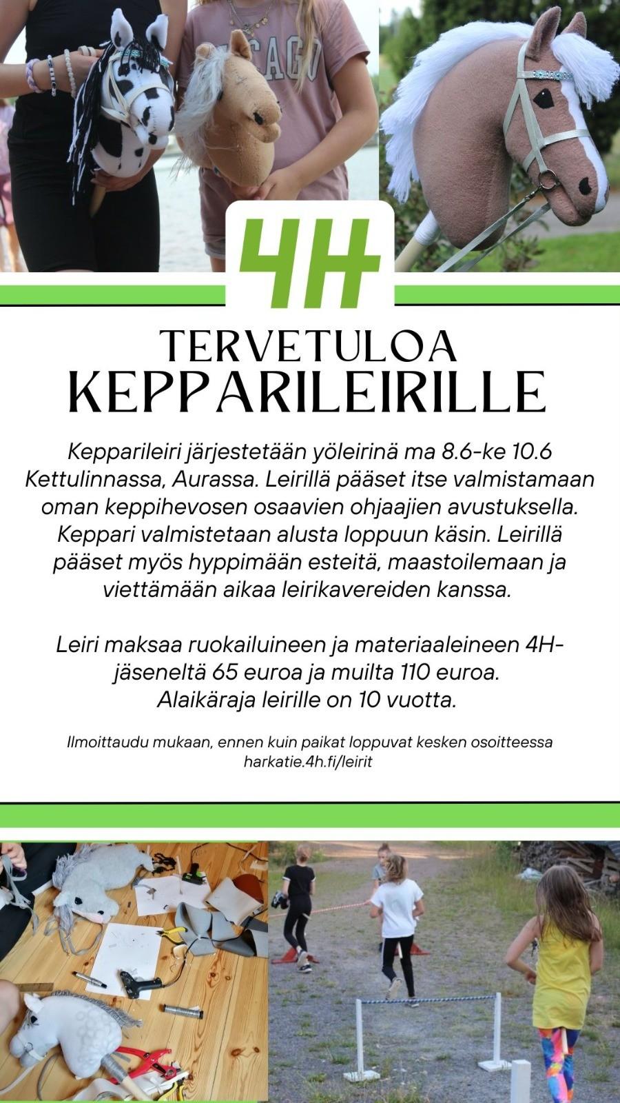 Leirimaksu sisältää ohjelman, tarvikkeet uuteen keppihevoseen ja ruokailut on 110 e/henkilö,4H-jäsenille hinta 65 e.